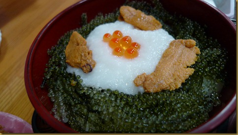 海葡萄蓋飯是滿滿的一大碗海葡萄加上山藥糊、海膽、鹹鮭魚子,除了飯以外,其它的其本上我都不太敢吃,所以問我好不好吃不準,真的要我說的話,我想就是一整個〝溝溝〞的口感~~嗯,這東西對我來說一定要吃一次,但吃過了知道它是什麼就好~~